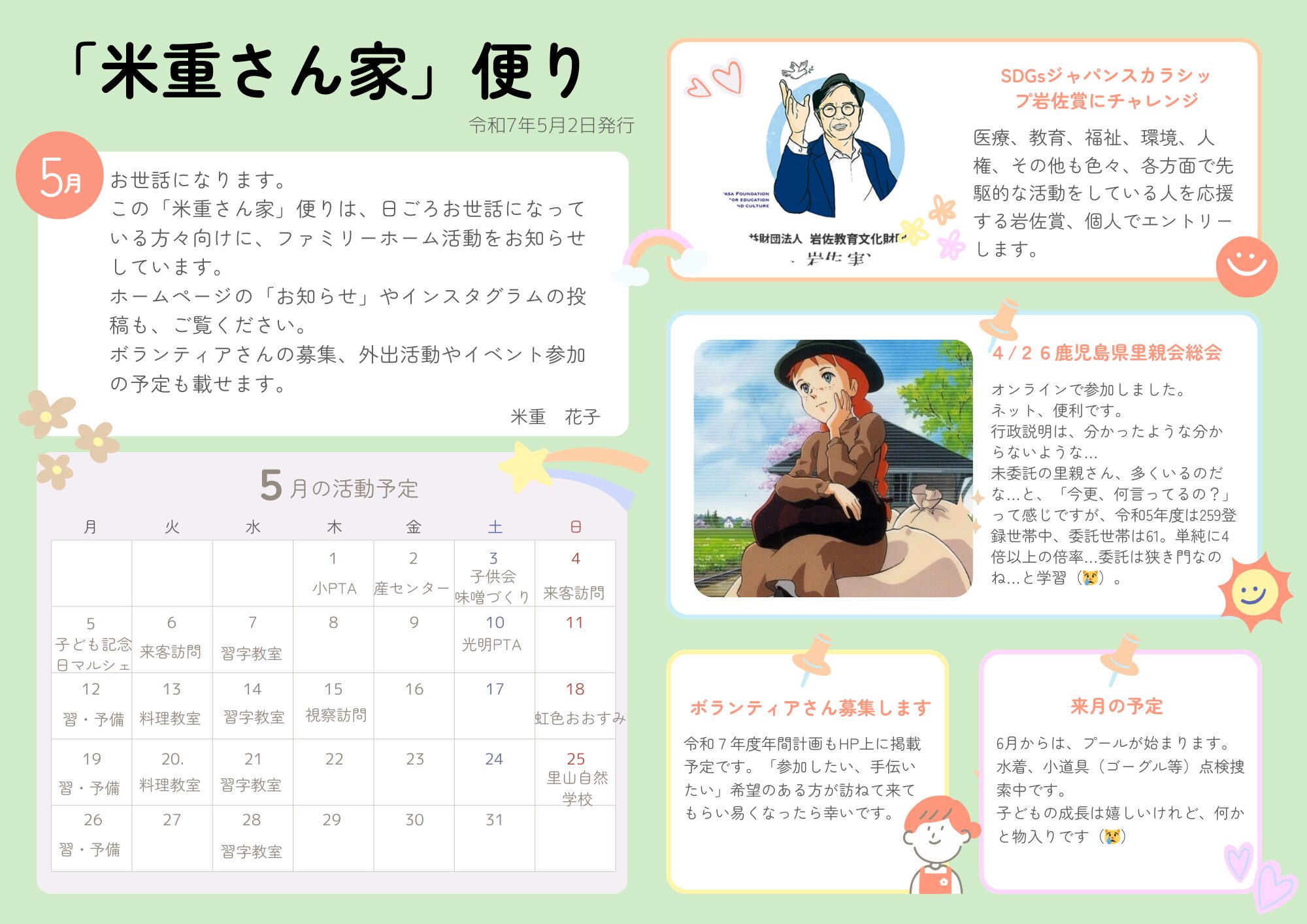 「米重さん家」便り 5月号 2025 5/03 お知らせ 2025.05.03 一カ月が過ぎるのは、本当に早いです。「米重さん家」便り5月号を作りました。ご覧ください。月末には準備をしなくてはいけない…と分かっているのに、月初めに大慌てて作成しました。続けることに価値がある。そう信じて、頑張ります。委託児童(里子ちゃん)は、来ていません。この近隣地域が「平和」との証です。 お知らせ